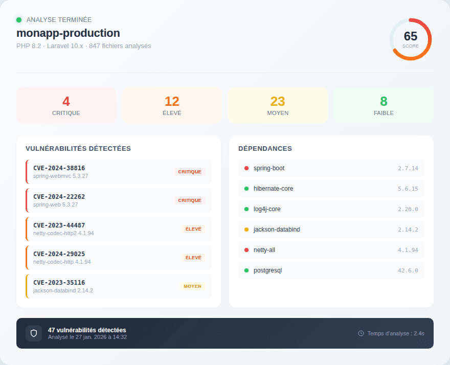 Vous savez que vous avez de la dette technique, mais par où commencer ? Le bilan classe vos vulnérabilités par criticité et vous montre quelles dépendances concentrent le plus de risques.